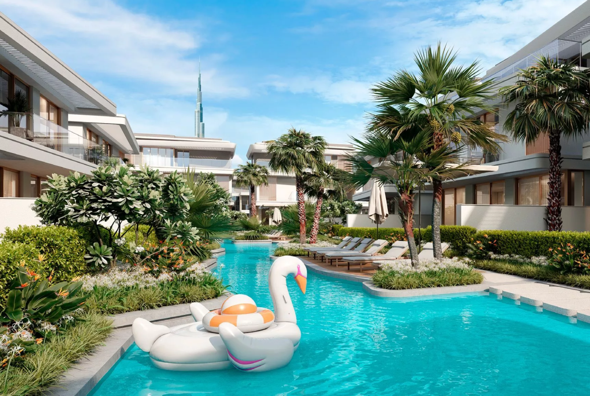 Residents will enjoy exclusive amenities, including a clubhouse, community centre, a temperature-controlled lazy river, and a terrace overlooking the Burj Khalifa. The master plan also includes playgrounds and a school.