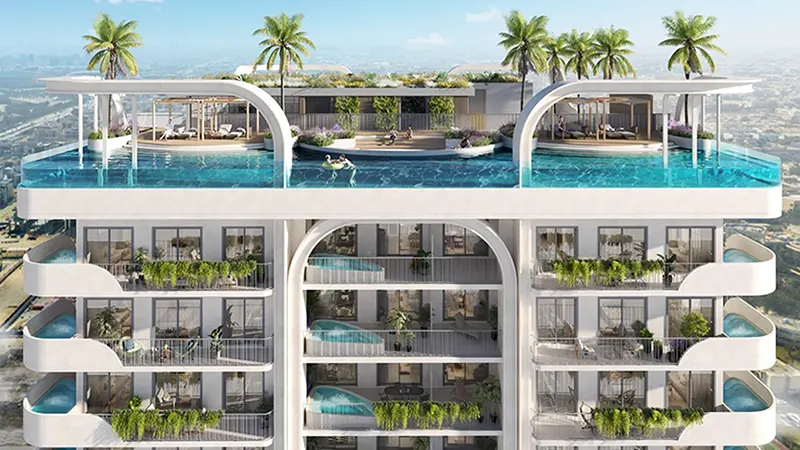 The architecture and design are inspired by the serene Alpine aesthetics of France and Switzerland, bringing a touch of European elegance to Dubai. The contemporary design of the building, with its clean lines and dynamic flair, draws inspiration from the natural beauty of the Alps. This is evident in the building’s unique architectural elements, such as the feature arches and vertical lines that emulate the effect of snow melting on alpine peaks. These elements are complemented by iconic balcony designs that add a modern twist, creating a dynamic yet serene living environment.
